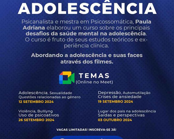Os principais desafios da saúde mental na adolescência são o foco do curso ‘As diversas faces da adolescência’, desenvolvido por Paula Adriana, psicanalista e mestre em psicossomática.